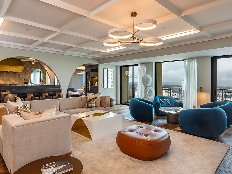 Turnkey Designer Furnished Condominium. Nestled within the distinguished Remington Private Residence Tower in Westwood and following a three-year gut renovation, this exquisitely designed 3/4 bedroom, 3.5 bathroom condominium is a masterclass in modern luxury and timeless sophistication in pristine move-in condition. Complete furnishings available for purchase, including custom-made furniture, designer lighting and chandeliers, custom rugs, Frette linens, comprehensive AV system, window coverings, extensive kitchen cookware, appliances and flatware. Encompassing 3,283 square feet, the home welcomes you from your Private Elevator directly into your gracious formal foyer, unfolding into a sun-drenched, open-concept living space framed by floor-to-ceiling windows and an extensive terrace that captures breathtaking panoramas of the city skyline. The interiors unfold with an artful balance of drama and refinement. Rich chevron-patterned hardwood floors and custom coffered ceilings guide you to the striking black marble gourmet kitchen, where bold design meets everyday functionality. State-of-the-art Miele appliances, a walk-in pantry, and a custom breakfast nook create an inviting space that transitions effortlessly from quiet morning rituals to vibrant gatherings. The adjacent office/den/4th bedroom outfitted with bespoke cabinetry and sliding glass doors, doubles as a versatile sanctuary with access to a private terrace. A dedicated laundry room and extensive storage add convenience. A marble-clad hallway leads to a serene guest suite, designed with privacy and comfort in mind. On the opposite wing, the primary suite defines luxury living. An entryway lined with mirrored panels sets the tone, while recessed and paneled custom ceilings and expansive windows frame the glittering cityscape. The suite extends to a private terrace, a tranquil haven from which to savor the views. The ensuite bathroom is a spa-like retreat, featuring a stone-clad walk-in shower, a deep soaking tub, a private infrared sauna, and a custom dressing room that rivals the most elegant ateliers. An additional ensuite guest suite and formal powder room complete the home. Throughout, thoughtful design details -architectural arches, custom contemporary finishes, and discreet hidden storage - imbue the residence with an air of bespoke sophistication, where every inch has been meticulously curated. Modern conveniences such as a Crestron smart-home system, automated shades, and custom lighting ensure effortless living, seamlessly blending luxury and technology. As part of the two dedicated parking spaces, a coveted submeter purchased for a private EV charger. Additional separate storage room and wine locker are included. More than a residence, this exceptional offering sets a new standard for vertical living in Los Angeles' most coveted address- a harmonious fusion of artistry, design, and comfort. Residents of The Remington enjoy unparalleled amenities synonymous with elevated living: 24-hour valet parking, a stately library and fireside lounge, a grand banquet hall, an outdoor pool, a state-of-the-art fitness center, and expansive alfresco dining areas complete with a cozy outdoor fireplace.