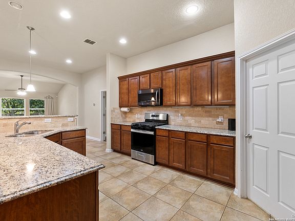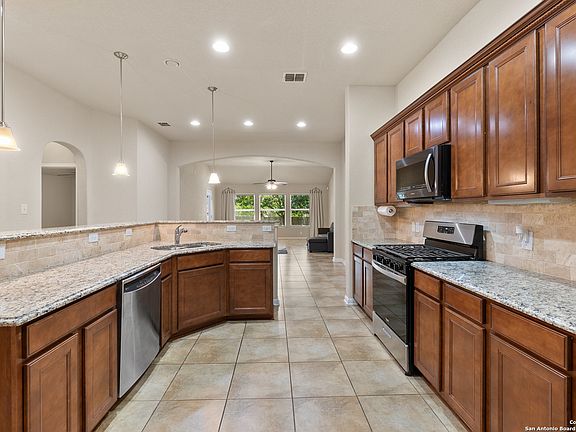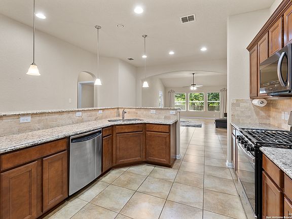Welcome to 10728 Barnsford Lane - a home that blends modern efficiency, flexible living, and unforgettable family gatherings in the heart of Helotes' desirable Triana community. Nestled at the end of a peaceful cul-de-sac, this property offers the perfect balance of privacy and connection. Step inside to an open, airy floor plan designed for today's lifestyle. A spacious living and dining area flows seamlessly into the kitchen, making it easy to entertain or enjoy family meals. Thoughtful touches like the den/TV room nestled between two guest bedrooms create a private retreat for movie nights, playtime, or a quiet study area. And with a 3-car garage, there's room for vehicles, storage, or even a home gym. The heart of the home extends outdoors to a backyard made for entertaining. Manicured with lush artificial turf for year-round greenery, it's both low-maintenance and high-style. Host summer BBQs under the covered patio, relax in the custom swim spa, or simply enjoy peaceful evenings in your private oasis. This home is also a standout in value and efficiency. Paid-off solar panels with battery backup dramatically reduce utility costs while providing reliable energy. Major updates bring peace of mind, with the roof, AC system, backyard upgrades, and swim spa all less than three years old. Whether it's family celebrations in the backyard, quiet nights in your den, or the everyday ease of cul-de-sac living, this home is built to be enjoyed for years to come. Don't miss your chance to make it yours.