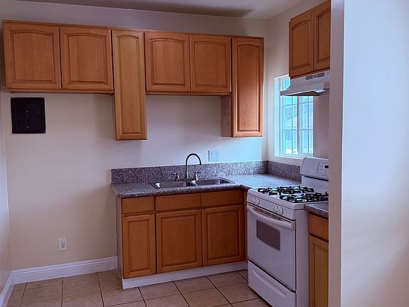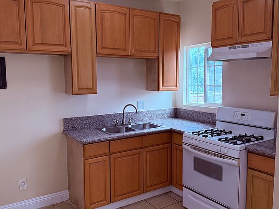 The kitchen is clean and functional, equipped with plentiful wood cabinetry, granite-style countertops, a double-sink, and a full-size gas stove with a built-in vent hood. A large window brings in great natural light, making the space feel warm and inviting.
