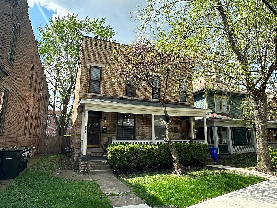 Brick duplex in Italian Village with a front porch, central air conditioning, hardwood floors, off-street parking for purchase and plenty of room in the fenced in backyard. There is washer/dryer in the unfinished basement.