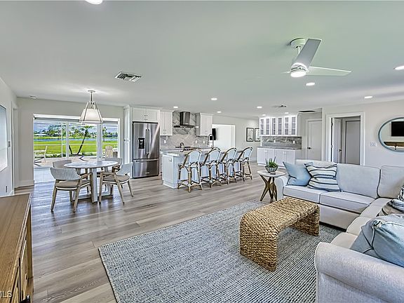 Inside, nearly everything has been rebuilt new and upscale -- transforming this residence into a modern island home with the confidence of new construction. A reimagined open kitchen anchors the living space, featuring custom cabinetry, upscale stainless appliances, full quartz countertops and backsplash, and elegant task lighting. Both bathrooms were completely rebuilt with designer tile, frameless glass showers, new vanities, fixtures, and flooring. Every surface and system has been renewed, including luxury vinyl plank floors throughout, all new interior doors and hardware, new electrical and lighting throughout, and a brand-new HVAC system with UV air purification for enhanced indoor air quality. The 350 sq ft glass-enclosed Florida sunroom, fully integrated under air, offers panoramic golf and lake views—perfect for relaxed mornings or sunset entertaining in total comfort. All just a short walk or golf-cart ride to The Dunes Golf & Tennis Club and pool. Rebuilt from the inside out, this home unites new-construction quality with precision craftsmanship and coastal engineering—delivering lasting comfort, security, and style.