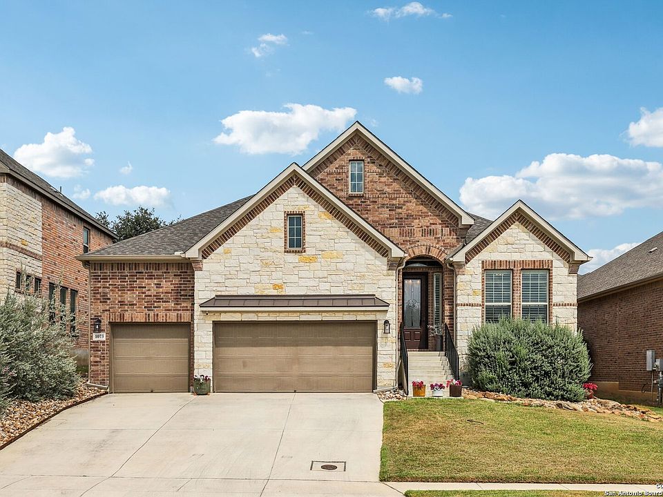 Discover the perfect blend of elegance and functionality in this stunning one-story residence, designed for both relaxation and entertaining. As you step through the inviting etched glass front door featuring a Texas Star, you'll be greeted by a warm foyer with exquisite hand-laid ceramic tiles that resemble rich hardwood flooring. The spacious open floor plan effortlessly guides you from a sophisticated study to a gourmet kitchen that will delight any chef. With gorgeous granite countertops, a high-end gas cooktop, and a striking island highlighted by Texas Star pendants, this kitchen is a culinary masterpiece. The breakfast bar flows seamlessly into a charming family room, complete with a fireplace and custom built-ins, creating the ideal space for unforgettable gatherings. An elegant formal dining room awaits, ready to host all your celebrations and family dinners. Retreat to your private primary suite, a true sanctuary featuring a luxurious en-suite bath with dual vanities, his and hers closets, a relaxing garden tub, and an oversized shower designed for ultimate serenity. Two additional well-appointed bedrooms and a spacious hall bath provide comfort for family and guests. Plus, the dedicated media room is perfect for cozy movie nights and entertainment! Step outside to your expansive covered patio and beautifully landscaped backyard-a true outdoor oasis for summer barbecues and peaceful afternoons in the fresh air. Don't forget the spacious three-car garage for all your storage and parking needs! Nestled in a friendly neighborhood with fantastic amenities, including a charming park and playground, this exceptional home perfectly combines classic Texas charm with modern conveniences. Discover the extraordinary features this Hill Country gem has to offer!