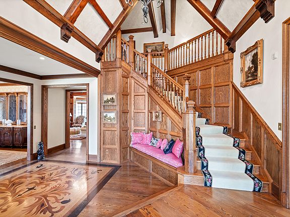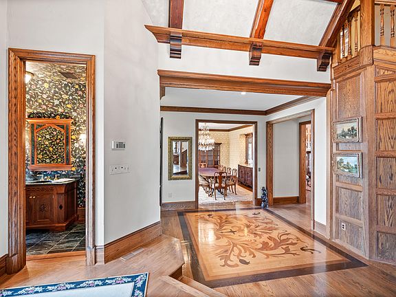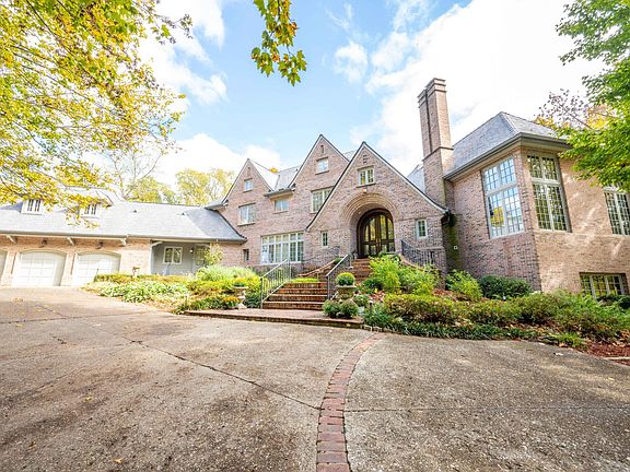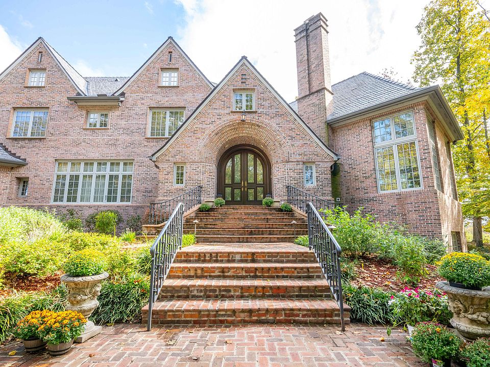 Magnificent English Tudor home boasting over four acres and nestled in a beautiful, wooded setting overlooking a lake front in Triple Crown. This 6 bedroom, 5 full and 2 half bath home was planned to showcase hand craftmanship in the tradition of the Arts and Crafts era begun in England the latter half of the 19th century. This two-story distinctive brick home has a multi gabled roof featuring dormers, small pane windows with three tall chimneys. Two tiers of steps lead to an oversized mahogany door with leaded restoration glass panels. The entry foyer floor has a custom wooden design inlay. Hardwood floors run throughout the first level. This home has 5 wood burning fireplaces, handcrafted cabinetry throughout and a primary suite which includes a sitting room, walk in closet and luxurious bath. The kitchen is designed with custom cabinetry, granite countertops, ''Wolf'' gas range cooktop on the center island, ''Sub-Zero'' refrigerator and double ovens. The living room has newly added remote custom draperies. Finished lower level with parquet oak flooring, custom bar, wine cellar, steam room and much more. An English Garden with fishponds and a waterfall leading to a spectacular gunite pool are just a few of the amazing features in the rear of the home. This house is certainly a must see for the right buyers.