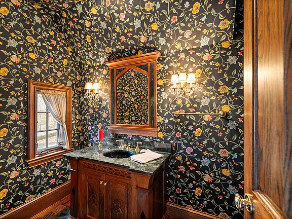 Over four acresSpectacular gunite poolOverlooking a lake frontBeautiful wooded settingCustom barThree tall chimneysSteam room