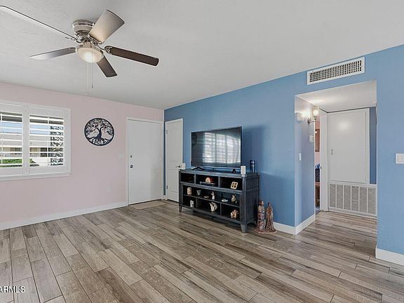 This beautiful remodeled 2-bedroom, 2-bath entertainers home offers the perfect blend of style, comfort and convenience. Enjoy peace of mind with a 2-year-old roof and 3-year-old HVAC system. Every detail has been updated- luxury flooring, 4 1/2'' baseboards, new doors/hardware, energy efficient dual-pane windows and elegant quart countertops. The kitchen boasts custom soft-close cabinets, designer backsplash ans stainless steel appliances. Bathroom feature newer vanities, fixtures and custom tiled walk in shower. With fresh paint, recessed lighting and modern ceiling fans, this move-in-ready home delivers the best of Sun City near recreation, dining and shopping.