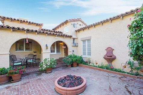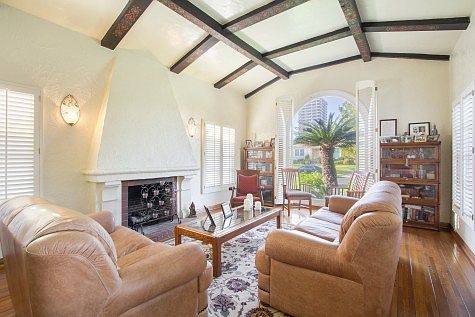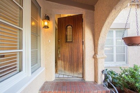 Authentic 2 bed/1.5 bath Spanish Courtyard in Prime North of Santa Monica neighborhood. Incredible unspoiled charm and character throughout. Inviting brick courtyard patio with gas fire pit and fountain leading to covered porch with city light views. Formal entry with closet opens to step down living room with dramatic vaulted wood beamed ceiling, picture window and fireplace. Formal dining room with soffit ceiling leads to archway entry to remodeled kitchen with newer cabinetry, granite countertops, marble flooring, stainless steel appliances, breakfast area overlooking front courtyard. Butler's pantry leads to large sunny laundry room with backyard access. Sun-filled master bedroom with french door to private backyard. 2nd bedroom with coved ceiling. Features include updated full bath with separate bath and shower, hardwood flooring, shutters, upgraded electrical and newer hot water heater. Ready for your own personal touch and updates. Fairburn Elementary School.