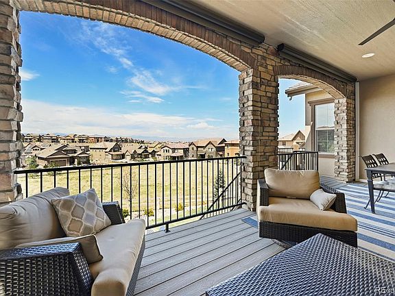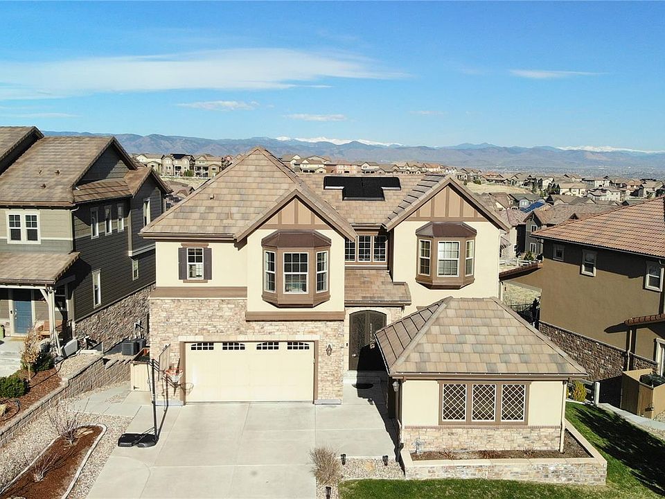STUNNING MOUNTAIN VIEWS FROM ALL 3 LEVELS OF THIS BACKCOUNTRY HOME! Backing to open space, the views welcome you as you enter this home featuring 5 bedrooms and 5 bathrooms. Enter through the custom Tuscan style security double gate to an open floor plan consisting of a large eat-in kitchen with upgraded stainless steel appliances and stone accented quartz island, family room with extended stone fireplace and surround sound, and dining room with sliding door access to the extended deck with remote sunshades. Off the foyer sits a large office with French doors and custom built ins. Even the main floor laundry with workspace has incredible mountain views! The orientation of this floorplan maximizes unparalleled mountain views from the primary suite featuring 2 walk in closets, frameless shower door, soaking tub and upgraded tile, and vanity. Find three additional bedrooms upstairs, two of which have bay windows. Two of the bedrooms share a jack and jill bath and the 4th bedroom has a bay window and en-suite bathroom. The finished walk out basement level features a 5th bedroom with walk in closet and en-suite bath, a game room area with wet bar, and theater room with surround sound. Notice the upgraded stone accent walls on this level. Watch those amazing Colorado sunsets while getting cozy around the built-in fire pit area or take a soak in the hot tub on the expanded lower patio. Reap the benefits on your energy bills with paid off solar system! Be sure to check out the community Sundial house offering fitness area, dining, outdoor pools and hot tubs, social events and more!