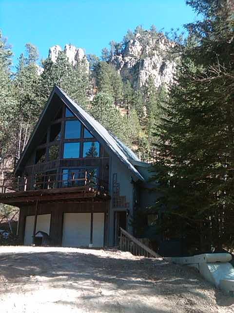 This picture perfect A-Frame is nestled in Spearfish Canyon. It is the most glorious drive ever experienced! This spot is as convenient as can be to Spearfish proper, while still feeling like you're in your own private paradise. The space boasts the original mid-century mod styling coupled with relics from the old gold mine to create a modern industrial aesthetic with style for miles! The original finishes are pristine with main level wood floors recently sanded and sealed. There is a bathroom on each of the three floor levels for your convenience including a Jacuzzi tub on the main level PLUS a 4 person hot tub in the solarium addition. The cedar lined hot tub area was built around a giant boulder from the gold mine foundation for added interest! A 2 car garage, finished basement workshop, several off-street parking spaces -- along with a newer W/D are included. This space is perfect for the hipster couple or adventure seeking empty nesters. Tenant pays all services -- which includes electric/wifi/garbage service. We cover water/septic/snow push on the road in, but you shovel your own driveway and patio decks front and back.