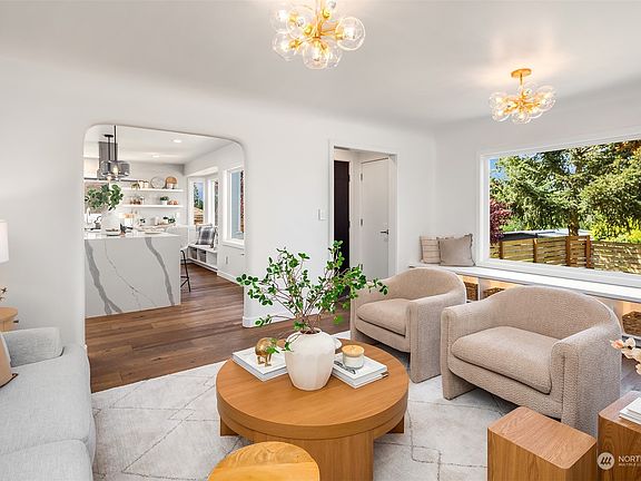 Indulge in this captivating Broadview Craftsman sanctuary, boasting breathtaking Puget Sound views. This charming brick home features 3BD, 1.75BA, meticulously designed to embrace modern elegance. Inside, be greeted by cascading natural light through bay windows. Delight in the warmth of the wood-burning Kiva fireplace, quartz countertops that adorn the kitchen, inviting culinary creativity. Pamper yourself with the luxurious sauna shower, adding opulence to your routine. Retreat to the primary bedroom, where a cozy gas fireplace awaits - a perfect ambiance for relaxation.The property offers customization with a versatile garage/outbuilding and potential for a DADU - NR2 zoning. Fully fenced for privacy, outdoor space invites tranquility.
