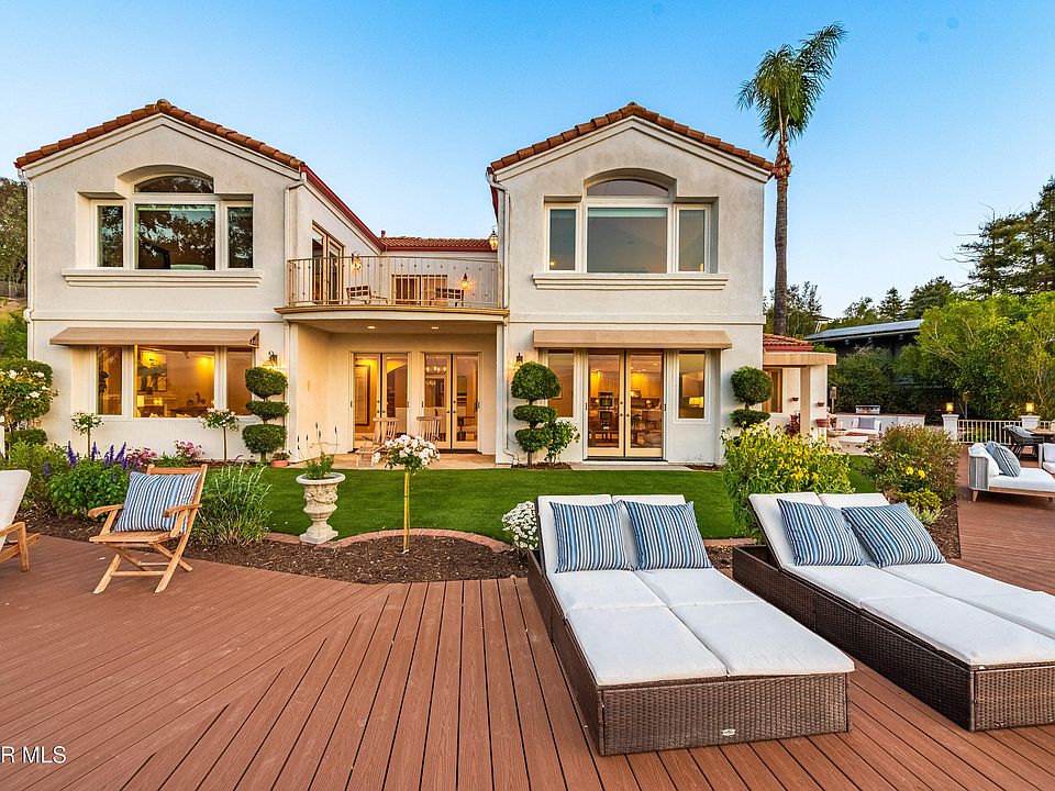 Welcome to 1074 Deseo Avenue, a stunning residence perched in the prestigious and highly sought-after Las Posas Estates in Camarillo. Situated on a prime hilltop lot, this home boasts breathtaking panoramic views that span across the valley to the majestic Topa Topa Mountains. Step through the foyer into an expansive open floor plan featuring soaring ceilings and wide-plank oak hardwood flooring throughout. At approximately 3,700 square feet, this home offers 4 spacious bedrooms, 3 full bathrooms, and a versatile office/bonus room that could easily serve as a 5th bedroom. A convenient downstairs bedroom with ensuite bath is perfect for guests or family members. The chef's kitchen is beautifully appointed with granite countertops, stainless steel appliances, and a built-in wine fridge, seamlessly opening to the family room— where you can really enjoy your family and friends while cooking. Enjoy cozy evenings by one of the home's three fireplaces, one nestled in the primary bedroom. Outside, the extremely private backyard is an entertainer's dream. A recently updated 1,600 sq.ft. wraparound Trex deck provides the perfect setting to soak in the views. Relax in the spa with cascading waterfall, gather around the large fire pit, or cook outdoors at the built-in BBQ area—all while enjoying the serene mountain and valley vistas. The property has been freshly landscaped and includes an oversized gated side yard ideal for RV parking. Additional upgrades include new recessed lighting, newer A/C system, designer carpeting, newer water heater, and newer spa equipment. Private, scenic, and exquisitely maintained, this is a truly special property waiting for your arrival.