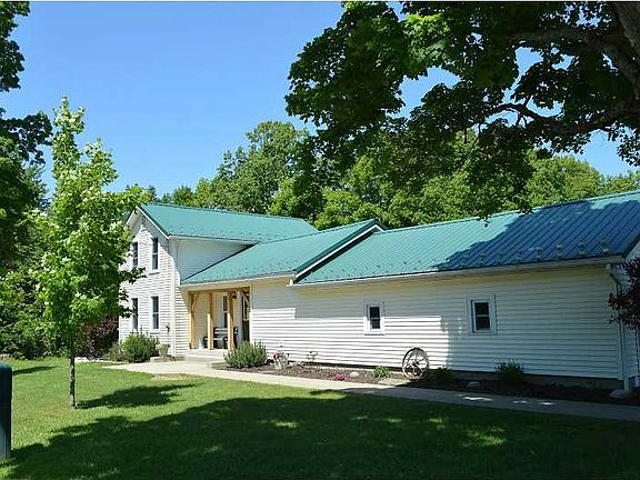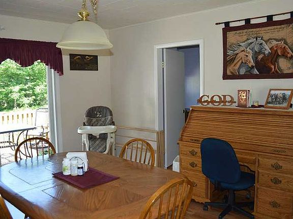 Home is a truly in move-in condition. Newer vinyl siding, metal roof, and newer windows. Laminate flooring in LR, DR, and kitchen. Bathroom has been remodeled. Back deck access from kitchen or DR. Two-stall barn with chicken coop and additional storage above. New landscape with perennials along front cement sidewalk. Asphalt driveway. Attached garage is oversized for extra storage or workshop.