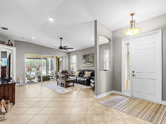 Stunning water, golf, preserve views, all from this large villa home that is being offered turnkey.  This WCI built home in the neighborhood of Toscana at Pelican Preserve has beautiful landscaping, solidly built construction, plus a bonus of Natural Gas.  You will feel the spaciousness as you enter into 12' vaulted ceilings and the incredible views.  This 3 bedroom, 2 bath home has re-engineered wood floors in the primary and one guest bedroom with tile throughout the main living area including the second guest bedroom.  There are newer appliances, some just a year old, plus a new tankless hot water heater (Oct. 2025).  The windows and doors are all impact with additional StormSmart screens on the lanai for added protection.  The exterior of the home was painted 3 years ago and the HVAC was replaced in 2013 with service performed every 6 months (last in Oct. 2025).  Pelican Preserve is a nationally recognized active adult 55+ community with endless amenities including the Flip Flops outdoor restaurant, 3 pools, Tennis, Pickleball, Bocce, Softball, Fitness, Movie Theater, Billiards, Hobby Rooms, Amphitheater, Destinations indoor restaurant, plus many special events throughout the year. The Brokke Center includes a Library, Card Rooms and Coffee Center for socializing with friends. Pelican Preserve has a 27 hole Private Golf Club with optional memberships.  Pelican Preserve is a short drive to RSW Airport and many shops and restaurants and the gulf coast beaches.  You know the saying, "You Can't Change Location", so why not make this your home, move right in and start to enjoy the breathtaking sunrises and the resort lifestyle.