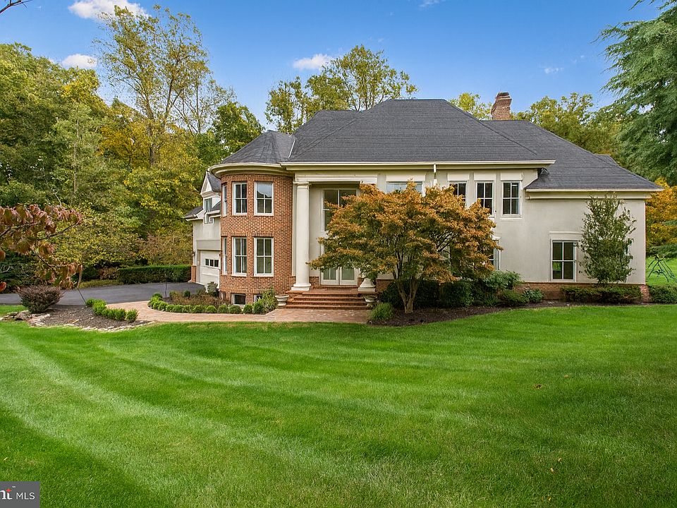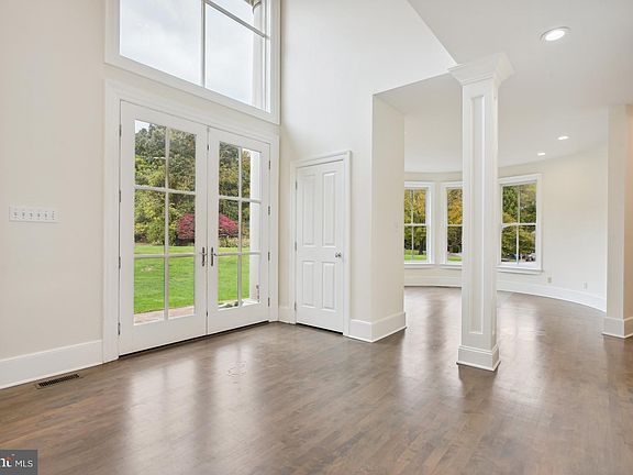 This exceptional property is peacefully situated in a cul-de-sac, mere minutes away from the Great Falls Village Shopping Center. It effortlessly harmonizes elegance, practicality, and the beauty of nature. The interior is flooded with natural light, adorned with lofty ceilings, and adorned with distinctive Turret windows that define its unique character. The main entrance foyer features impressive two-story columns and a striking brick front walk. To the left, a versatile space with Turret windows can become an elegant office or formal sitting area. French doors connect the brick patio, creating a perfect spot for entertaining in the living room with a contemporary granite fireplace. The second floor features four bedrooms, including a luxurious primary bedroom with cathedral ceiling, fireplace, private balcony, and a luxurious bathroom. The walkout basement offers entertainment space, a game room, and a well-appointed bar.
