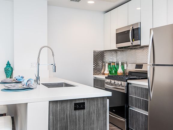 Stylish flooringLarge rooftop sky deckMobile-friendly thermostatsElegant quartz countertopsSleek stainless steel appliancesIn-unit washer and dryerTwo-tone cabinetry