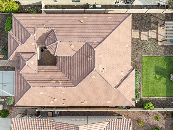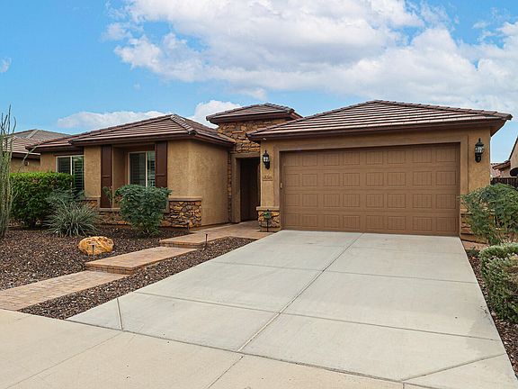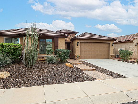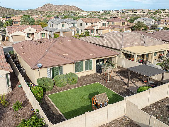 Beautiful single-level home with 3 bedrooms, 2.5 baths, and a spacious flexible den ideal as an office or easily a 4th bedroom. Great curb appeal with a private paver courtyard and inviting entry. Popular great room floorplan with wood-look tile, bright natural light, and an open airy feel. Chef's kitchen features a large island, breakfast bar, upgraded cabinetry, KitchenAid appliances, gas range, and huge walk-in pantry. Expansive primary suite with a well-appointed bath. Low-maintenance backyard with paver patios, pergola seating, and large artificial turf. Fantastic Peoria location near the 303, shopping, dining, Lake Pleasant, and a community park down the street. The home also offers a spacious laundry room, split bedroom layout, and plenty of storage throughout. The great room is perfect for entertaining, opening directly to the covered patio and extended paver spaces. Backyard is designed for easy upkeep with rock landscaping, pergola-covered seating area, artificial turf, and space for outdoor dining or a play area. Front courtyard adds extra privacy and charm. KitchenAid appliance package includes stainless gas range, dishwasher, and built-in microwave. Primary suite features dual sinks, large shower, and generous walk-in closet. Home is steps from the neighborhood park and minutes from major shopping, dining, and recreation.