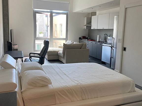 Rare top floor spacious PENTHOUSE studio with quiet courtyard views and big windows, super sunny, huge closet and bathroom, beautiful kitchen. Italian appliances, German cabinets, concierge, roof deck with stunning CITY VIEWS and two fire pits, bbq, included bike parking & repair station. Remote controlled window blinds for total darkness. Property is in near new condition as owner bought this as a NEW CONSTRUCTION in 2019.