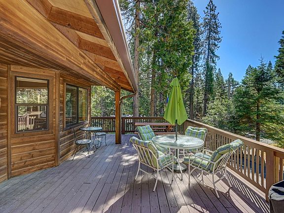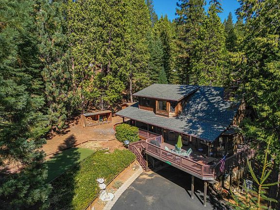 This charming chalet in Blue Lake Springs, Arnold, offers a serene mountain retreat with modern comforts. With 3 bedrooms, 2.5 baths, a spacious loft, and 1,795 square feet of living space, this home blends rustic beauty with convenience. The stunning great room features a two-story, open-beam cathedral ceiling, a rock fireplace with a cozy wood-burning stove, and built-in bookcases for your favorite mountain reads. The high windows frame breathtaking views of the trees and snow, making it an ideal winter haven. The kitchen is stylishly appointed with concrete countertops, terracotta floors, and updated appliances, while the formal dining area is perfect for family meals. The master bedroom, located on the main level, includes a luxurious ensuite bathroom with dual sinks, a large jetted tub, and a separate shower stall. Upstairs, the loftbathed in natural light from skylightsoffers a flexible space for a home office or TV room, alongside two additional bedrooms and a full bath. The home comes with central heating and air conditioning, whole house generator, central vacuum, and on-demand hot water. An inside laundry room provides outdoor access, adding to the home's functionality. The outdoor space is equally impressive, with a large deck wrapping around two sides of the house, perfect for enjoying local views. Two sheds offer additional storage or creative uses like a potting shed or she shed, and a private putting green adds a fun touch for golf enthusiasts. Located in the desirable Blue Lake Springs community, this property also grants access to a large swimming pool, two private lakes, tennis courts, and more. It's the perfect mountain getaway for relaxation and recreation.