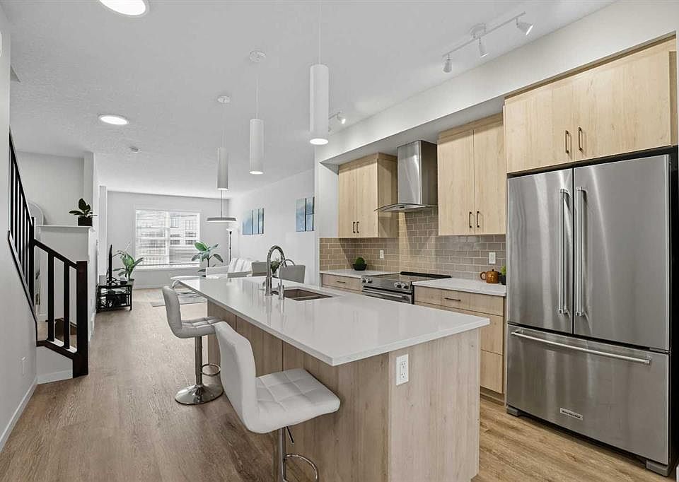 Welcome to 1075 Mahogany Boulevard SE, a pristine semi-detached home with nearly 1,700 sq. ft. of above-grade living space and a spacious basement offering huge future potential. Located in the sought-after lake community of Mahogany, this property blends contemporary design with family-friendly functionality. The main floor features a bright, OPEN-CONCEPT LAYOUT where expansive windows fill the living, dining, and kitchen areas with natural light. The CHEF-INSPIRED KITCHEN showcases FULL-HEIGHT CABINETRY TO THE CEILING, ELEGANT QUARTZ COUNTERTOPS, UPGRADED STAINLESS APPLIANCES, a SEPARATE HOOD FAN, BUILT-IN MICROWAVE, and a BUILT-IN WATER FILTER at the sink. A VERSATILE DEN/BEDROOM on this level adds flexibility for a HOME OFFICE, GUEST ROOM, or PLAY SPACE. Upstairs, unwind in the PRIMARY SUITE with a STYLISH 4-PIECE ENSUITE, while TWO ADDITIONAL SPACIOUS BEDROOMS share a SLEEK 3-PIECE MAIN BATH. A BONUS ROOM and UPPER-LEVEL LAUNDRY provide extra convenience for busy families. The basement offers 9-FT CEILINGS, TWO LARGE WINDOWS, and ROUGH-IN PLUMBING for a future bathroom, creating endless possibilities for a SUITE (subject to approvals), GYM, MEDIA ROOM, or EXTRA LIVING SPACE. A REAR DECK extends the living area outdoors. Enjoy year-round recreation with Mahogany’s LAKE, BEACHES, PARKS, TRAILS, SHOPPING, DINING, and SCHOOLS all close by. Move-in ready and impeccably maintained, this home delivers SPACE, STYLE, and a PRIME LOCATION, schedule your showing today.