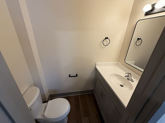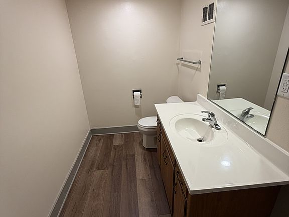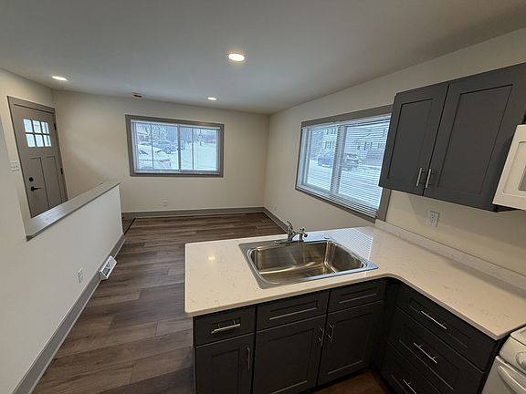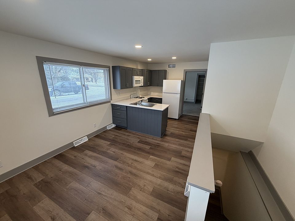 One Bedroom 1.5 bath. Unit is part of a triplex. On the main level is a full redone kitchen with living room, half bath and a bedroom. Down stairs is the full bathroom then a storage room with washer and electric dryer hook-up. One parking spot. lawn and snow care is handle by the other tenant in the building.