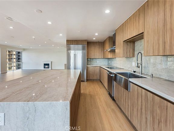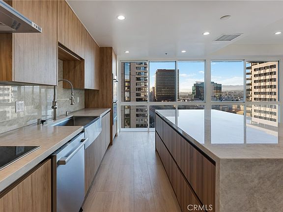 Enjoy wraparound views of the Wilshire Corridor, Westwood, UCLA, and Bel Air through floor-to-ceiling windows. The sleek renovation features beautiful quartzite countertops, custom kitchen cabinetry, wet bar, custom vanities, custom closets, recessed lighting, in-ceiling Sonance speakers, and a double wall oven. Additional highlights include a large terrace, standalone bathtub and dual sinks in the primary bathroom, in-unit laundry, two parking spaces, and a private storage unit.