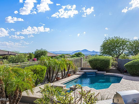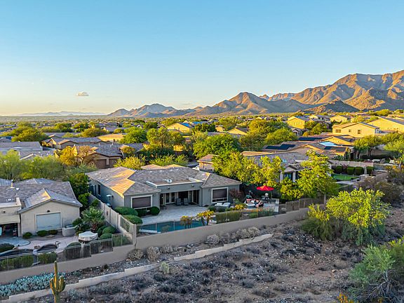 Spectacular single-level home with panoramic city light & Camelback Mountain views, perched above a desert arroyo in McDowell Mountain Ranch! This 4-bed, 2.5-bath, 3-car garage home features a split floorplan, elegant tile throughout (upgraded in Jan 2022), and a family room with a gas fireplace opening to the gourmet kitchen with 42 inch wood cabinetry, granite counters, double ovens & gas cooktop. The spa-like baths include a jetted tub and double sink vanity. Recent upgrades: tankless water heater & new water softener (Mar 2024), and newer AC. The entertainer's backyard boasts a heated salt water PebbleTec pool & spa w/ waterfall, built-in gas BBQ & fireplace, all with sunset views. Community amenities include pools, trails, fitness, & golf!
