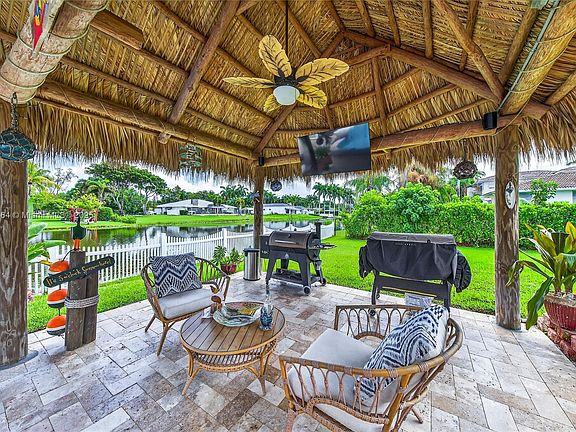 LUXURY OASIS ON A SPRAWLING BUILDERS ACRE-LAKEFRONT LOT IN DAVIE WEST! STUNNING TURNKEY 3 BEDROOM - 2 BATH + FLEX ROOM W/ROOM TO BUILD ON. RANCH STYLE HOME W/ OVERSIZED PAVED DRIVEWAY. DESIGNED FOR ULTIMATE COMFORT & UNFORGETTABLE ENTERTAINING. BACKYARD SHOWCASES TRAVERTINE AROUND SALT WATER POOL W/ SWIM UP BARSTOOLS. TIKI BAR, LARGE COVERED PATIO, FENCED YARD W/ SPACIOUS DECK ON THE LAKE, PERFECT FOR FISHING! KITCHEN HAS EXPANSIVE STORAGE, WOOD CABINETS, PASS THRU WINDOW, GRANITE COUNTERTOPS W/ LARGE ISLAND & EAT IN COUNTER, NEW FLAT ROOF W/WARRANTY, APPLIANCES & WATER HEATER. RENOVATED BATHROOMS & BEDROOM FLOORS. PRIMARY SUITE W/ WALK IN CLOSET. HURRICANE IMPACT WINDOWS & DOORS. NEW SPRINKLER SYSTEM RUNS OFF LAKE. EXCELLENT SCHOOLS. NO RESTRICTIONS-COMMUNITY IS ANIMAL, BOAT & RV FRIENDLY