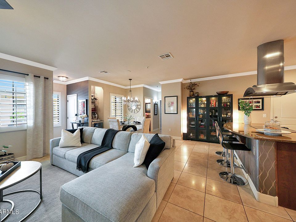 Elegant single story unit with N/S exposure and two (2) car garage in the heart of Scottsdale! PERFECT LOCATION! Most furnishings convey with full price offer. Just walk across the street to Harkins theatre, great restaurants, and shopping... This designers home has an open floor plan that seamlessly connects to the kitchen, dining and living area. Large primary suite/split second bedroom includes wall bed.& bookcases.. Gourmet kitchen boasts gorgeous stainless steel appliances. Stainless steel hood, granite counter tops, mirrored back splash, upgraded pantry door and large breakfast bar. Stone flooring, crown molding in all rooms and plantation shutters. Dining area also features a Wet bar, wine refrigerator and wine rack. EASY LOCK & LEAVE! Perfect second home. #1 Loc. in Scottsdale Seller would be willing to rent back for a couple of months