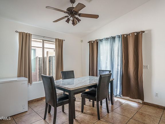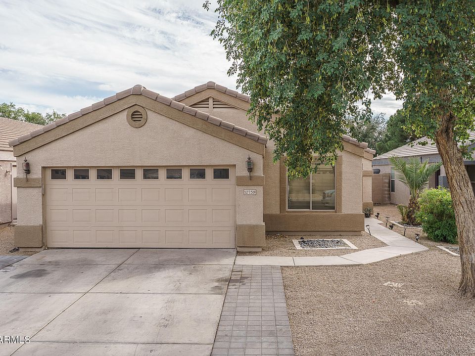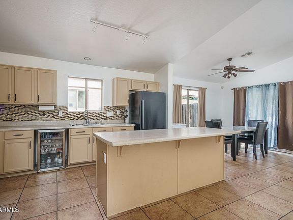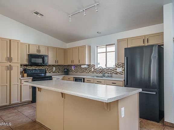 This inviting 4-bedroom, 2-bath home just two doors down from lush common space offers 1,631 sq. ft. of comfortable living space designed with an open great room layout, vaulted ceilings, & easy-care tile floors throughout—perfect for everyday living and entertaining. The kitchen features generous cabinet and counter space, black appliances, and a center island with extra storage and a breakfast bar, making meal prep simple and social. Step outside through sliding doors to a low-maintenance backyard complete with a spacious paver patio, firepit, and built-in BBQ with seating—ideal for gatherings with friends and family. The primary suite includes a full bath with dual sinks and a tub/shower combo, while the home also provides thoughtful upgrades like a whole-house water filtration system, soft water, and a 2-car garage. Backing to a common area with block fencing for privacy, this home combines convenience, comfort, and value - an excellent choice for buyers ready to make their move.