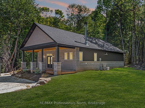 1076 Angel Road | Eagle Lake New Build | 3 Bed | 2 Bath | 1.84 Acres Nestled in the heart of the Eagle Lake community, just minutes from Sir Sam's Ski Hill, this brand-new 1,645 sq ft bungalow offers the perfect balance of modern design & natural tranquility. Set on 1.84 wooded acres, this home is a private retreat surrounded by towering trees, fresh air, & four-season adventure right at your doorstep. From the moment you arrive, the clean lines & welcoming charm of the covered front porch invite you inside. With a pine ceiling, pot lights, & timber posts, this space sets the tone for warm evenings with friends or quiet mornings with coffee in hand. Step inside to soaring 10-foot ceilings & an open-concept layout that feels bright and spacious. The living room is anchored by a floor-to-ceiling stone fireplace, creating a cozy gathering space for snowy winter nights. The kitchen is a showpiece, featuring a waterfall island, custom lighting, & walkout access to the outdoors. Thoughtful details are found throughout sound insulation for quiet living, USB plugs, hallway nightlights for convenience, & central vac for easy living. This home includes 3 bedrooms & 2 full baths, each with modern finishes. The primary suite is a relaxing retreat, complete with a stylish ensuite & walk-in shower. Comfort is at the forefront with forced-air propane heating, central air, drilled well, & septic system. Outside, you'll love the detached 2-car garage for storing vehicles & toys, plus a backyard fire pit area, the perfect spot for making memories under the stars. Trails wind through your very own forested property, giving you privacy & connection to nature while still being close to amenities. Whether you're looking for a full-time residence or a weekend getaway, this property checks every box: space, style, & setting. 1076 Angel Road, Eagle Lake, modern country living in the Haliburton Highlands. *Some images have been virtually staged/altered/rendered* Taxes Not Yet Assessed*