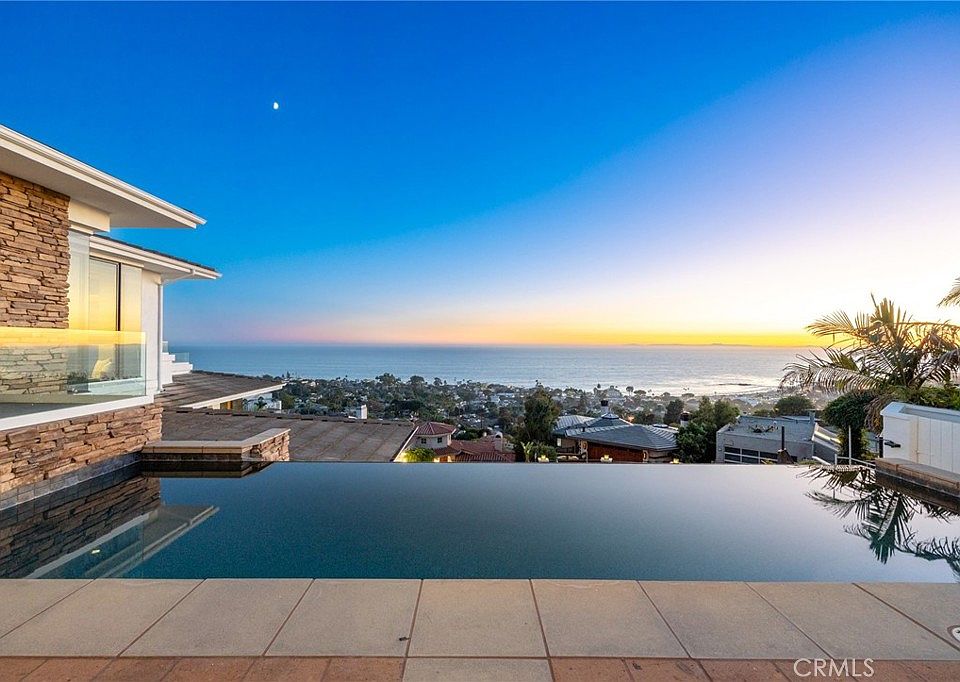 Perched in one of the world’s most celebrated coastal destinations, this rare estate-sized residence in Laguna Beach offers a lifestyle of unmatched luxury and breathtaking beauty. Just blocks from the beach and the vibrant Village, the home commands sweeping panoramic views of Catalina Island and iconic Main Beach—an extraordinary vantage point few properties can claim. Spanning over 6,000 square feet of refined living space, this gated estate rests atop a generously elevated one-third acre lot, designed to maximize privacy and showcase the stunning seascape. The exterior features an infinity-edge pool that seemingly spills into the Pacific, a three-car attached garage, and a multi-vehicle motor court, all framed by sculpted hardscape and a curated palette of coastal succulents. Inside, the home is a masterclass in architectural sophistication and custom craftsmanship. Highlights include: a gourmet chef’s kitchen with premium finishes, a glass elevator offering ocean views on every ride, rich teak flooring throughout, a dedicated home theater for cinematic indulgence, and fireplaces in the living room, primary suite, and outdoor terrace—perfect for cozy evenings by the pool. The layout features three luxurious bedroom suites and a spacious office that easily converts to a fourth bedroom, offering flexibility for guests or remote work. Smart home amenities abound, including: integrated stereo speakers throughout, a sophisticated lighting control system, dual-zone heating and air conditioning, and comprehensive security and central vacuum systems. Powered by state-of-the-art solar panels, the residence delivers energy-efficient living while dramatically reducing utility costs. From the first light of dawn to the golden hues of sunset, this home captures the essence of Laguna Beach in every moment. Indulge in coastal elegance—where every detail is designed to elevate your lifestyle.