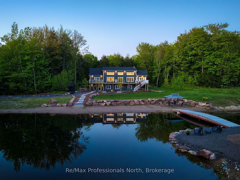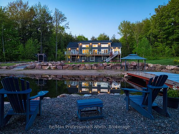 Welcome to 1076 Xavier Street situated in one of Muskoka's most desirable executive enclaves, an exceptional custom-built estate set on 7.17 acres just south of Gravenhurst's downtown. Set back from the road and hidden from view, this 2022-built home offers rare seclusion with a long granite-lined driveway, scenic pond with sandy beach and island, stunning outdoor living, and a 40' x 60' heated shop creating a Muskoka retreat that feels like your own private resort. A dramatic granite staircase leads to a covered front porch and into 3,602 square feet of beautifully finished space across two levels. Vaulted shiplap ceilings, expansive windows, and a striking black propane fireplace framed by floor-to-ceiling white shiplap define the great room. The entertainers kitchen features chiseled-edge granite throughout, including a statement island ideal for hosting. From the dining area, step out to a rear deck that spans the entire back of the home and overlooks your firepit sitting area, a tranquil pond, beach, and landscaped island framed by mature forest. A footbridge invites exploration, where the second firepit and Muskoka chairs offer the perfect vantage point for morning coffees or evening stargazing. The insulated Muskoka room offers passive climate flow from the home, a supplemental electric fireplace, and access to both decks. The private primary suite features direct access to the deck and hot tub, a walk-in closet, and a spa-inspired 5-piece ensuite. The fully finished walkout lower level offers a large rec room, two additional bedrooms, a full bath, and direct access to the backyard. At the rear of the property, a 40' x 60' heated shop includes 12' doors, hydro, and 3 piece bath ideal for the hobbyist, recreational gear, or as a private workspace and storage haven. A Generac backup generator provides year-round peace of mind. This is more than a home; it's an experience offering refined living, captivating scenery, and complete privacy in an exclusive setting.