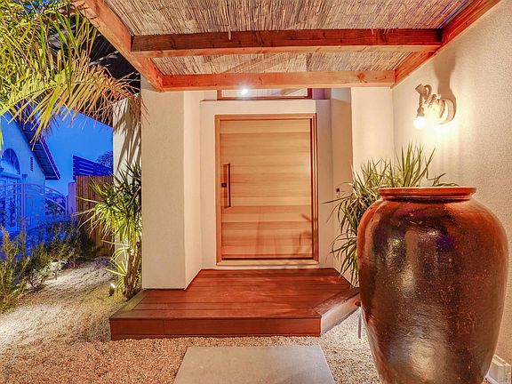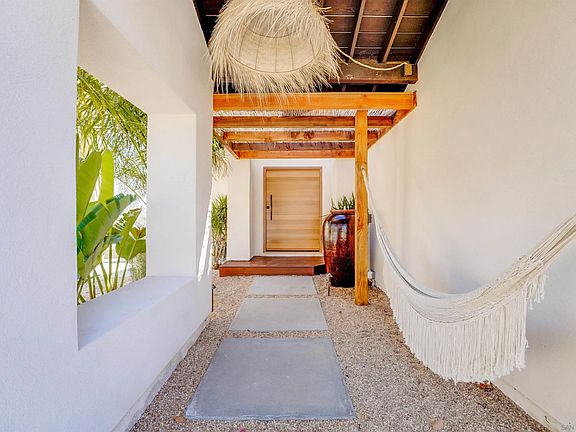 Come BUY the SKY! Never before have you seen a home like this in Scripps Ranch. This stunning, custom remodeled home sits atop all of San Diego on a canyon rim with Top of the World, 180 degree panoramic views from the mountains to the ocean. After 2+ years in the making, this Tulum-inspired warm modern design will leave you absolutely breathless, with its jaw-dropping views and gorgeous finishes. From the moment you arrive, you are greeted with an inviting curb appeal that leads to a covered portico, with poured-in-place concrete step ways and a relaxing hammock area with a gorgeous water feature. The modern, cedar front pivot door invites you in as you step inside to reveal layers of luxurious living! Soaring ceilings boast a beautiful hand crafted tongue and groove cedar wood ceiling with large accent beams. The living room is canvased in large format grey tile, super cool hanging chair, and faux designer fireplace area with designer tile background a colored concrete hearth. The stacked door systems open to offer a fresh breeze and the ultimate indoor-outdoor living you only find in luxury properties. Adjacent to the great room is the open concept kitchen and dining area. Mill colored poured in place concrete counters offer a textured leather finish. You will love the back-lit LED bar area as well as the minimalist shelving and chef’s oven range. The custom oak cabinets are stunning and feature modern hardware with a blend of Ratan and natural wood that blend perfectly with the soft wood ceiling.