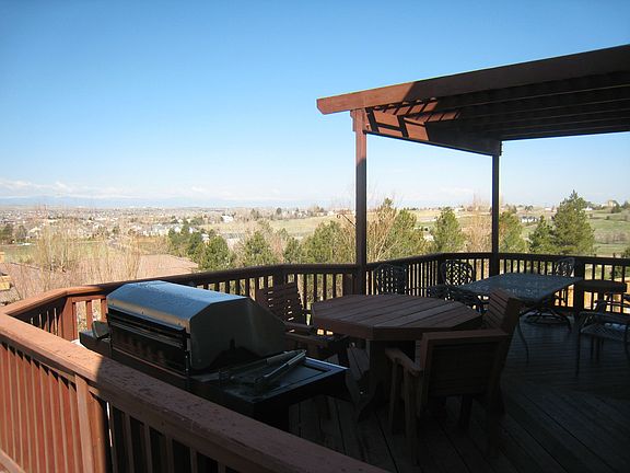 * Panoramic Mountain Views ( Mt. Evens, Pikes Peak and Longs Peak) * Back to open space. Beautiful 4 bedroom, 4 bathroom home plus first floor study/5th bedroom and loft study area. It has tall ceilings and 3 car garage. * Located in a quiet cul de sac. Heated bathroom tile floors * Two story home with granite counter tops throughout; Energy efficient Champion windows; * Fully finished, walkout basement; Built-in entertainment center with built-in surround sound; * Beautiful bar with fridge and dishwasher; work-out room; first floor office; gas fire place; five piece master bath with a jet tub. *Large deck and a brick patio; hardwood floors throughout the first floor and loft; heated tile floors; Central Air; * Incredible views of the entire front range mountains from the west side of the house. * Douglas County schools: Pioneer Elementary, Cimarron Middle School, Legend High School. * Close to downtown Parker and shopping; close to O'Brien pool and park; easy access to Cherry Creek bike trail system. * No Smoking. Pet Deposit $500 per pet. Credit Check $45 per adult (Not so good credit is OK, as long as you can prove your income or savings). Trash removal service is included. First month, last month rent and deposit are require at signing.