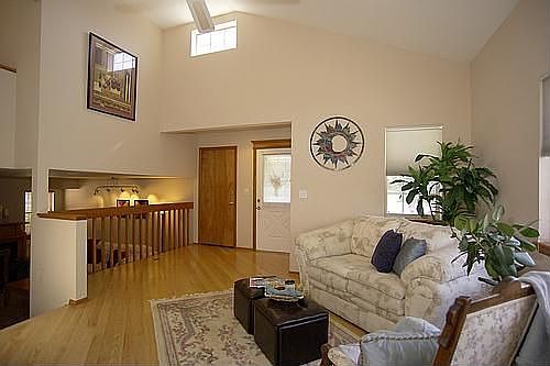 A masterful remodel with tasteful design and backing to a green belt with views to the nearby park and the mountains! Exterior features include a covered front porch with an inviting porch swing. A brick paver path adds curb appeal. There is a newer 2006 50 year composition roof and gutters, new exterior paint, new fence, 2005 maintenance free Trex deck, and a great privately fenced dog run with a matching dog house. The garden area is complete with a drip system. A flagstone path roams the side yard. The central air conditioning and furnace are dated 2005. Interior features are endless! The main level and stairs are beautiful re-finished hardwood floors. The balance of the home has brand new carpet (excluding the basement). A spacious living room greets you with vaulted ceilings and flows smoothly to the dining area located in a bay window. A complete kitchen remodel took place in 2007 with hardwood floors, cherry cabinets with crown molding, laminate countertops, Newer appliances including a microwave and side-by-side refrigerator, and a mobile island which provides lots of extra space! The pot rack is included. Down a few steps is the charming family room with a cozy wood burning fireplace that creates a warm atmosphere. A guest bedroom and full bathroom are located nearby. Upstairs you will find the master bedroom with yards of closets! An additional guest bedroom is just down the hallway. You will treasure the versatile space in the finished basement...it can be a TV/recreation room, office, playroom...you name it. The laundry room is huge with a utility sink and a clothes hanging rack. Bathrooms have been updated. There are new light fixtures. A radon mitigation system is installed.