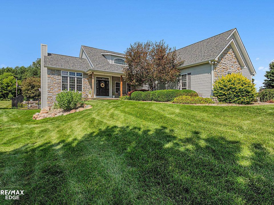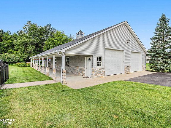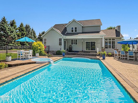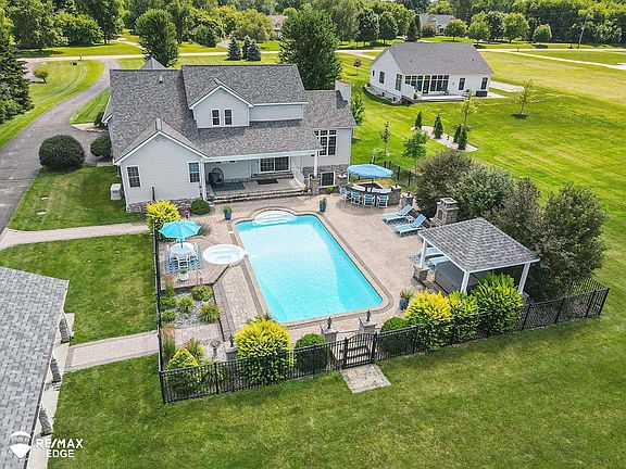Resort-style living meets everyday comfort in this exceptional two-story estate on 3.44 acres, designed for relaxation, recreation, and versatility. At the heart of the property is your own private oasis—a 36x18 in-ground pool surrounded by an expansive 63x53 brick patio, complete with a built-in bar, outdoor fireplace, and a spill-in spa with jets and a cascading waterfall. Whether hosting summer parties or enjoying a quiet evening under the stars, this backyard is pure paradise. Car enthusiasts and hobbyists will love the 3 car attached heated garage, detached 40x48 garage that is insulated, infrared heat, equipped with hot/cold water, full electrical service, and a covered porch. The secondary driveway offers easy access for larger vehicles or equipment. For extended family or guests, the 40x22 guest house/in-law suite provides complete independence with a full kitchen, large snack bar, cozy living room with fireplace, bedroom, bath, furnace, and central air, porch & firepit. Inside the main home, you’ll find a sun-filled great room with soaring ceilings and a custom fireplace, a gourmet island kitchen with granite countertops and high-end appliances, and a main-floor primary suite with direct pool access, ceramic tile bath, and a walk-in closet. Upstairs offers Jack & Jill bedrooms and bath, plus a bonus room ready for finishing. The lower level walkout features a patio, daylight windows, full bath and would be easy to finish for additional living space. 22kW Generac generator runs everything in a power outage. This property has it all!