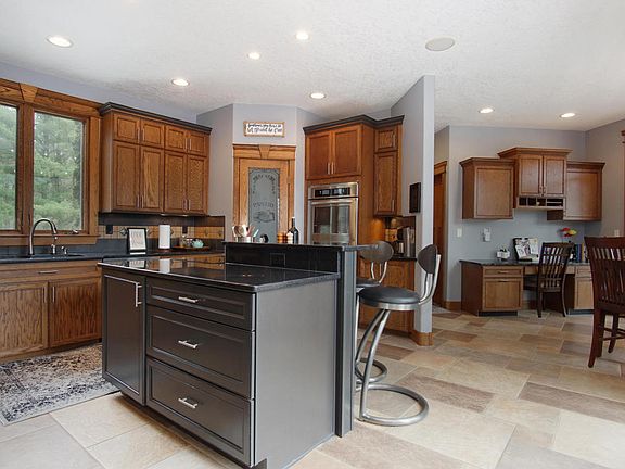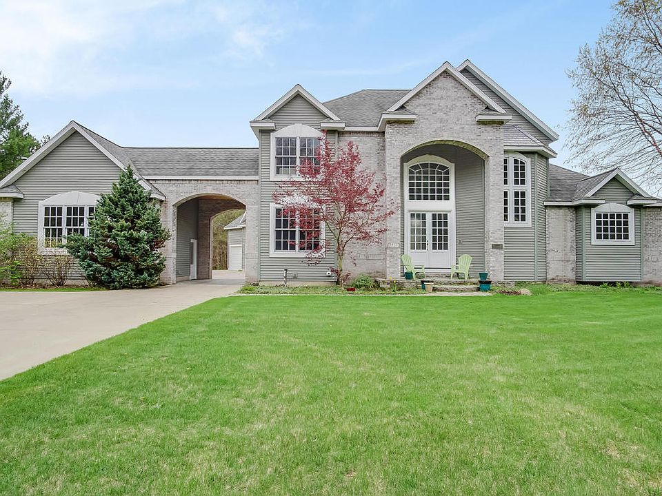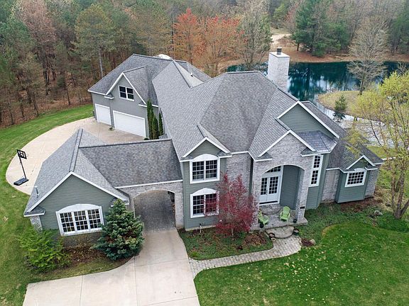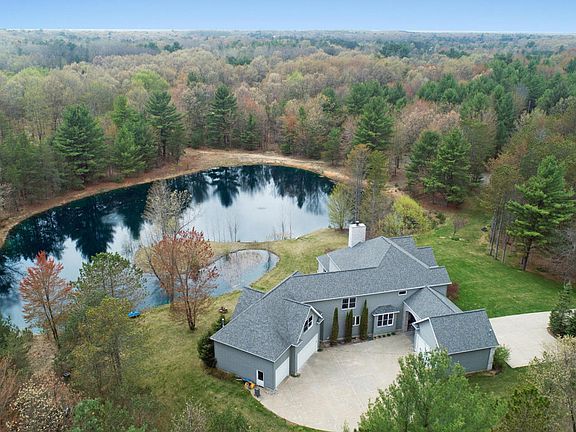 Incredible charm with breath taking views! One of a kind 5 bedroom, 4.5 bath home offering over 6000 square feet of living space situated on 28 acres and a 3 acre stocked pond. Set far off the road you will find a graceful winding driveway. The stone arch entrance is actually a drive through porte cochere that leads to 5 garage spaces. The grand entrance invites guest to enter the spacious foyer with gorgeous marble floors and 19' ceilings. The keystone detail trim throughout the home is only one of the amazing attention to detail items of the home. The gourmet kitchen offers heated tiled floors, black Angola granite, double ovens with a warming drawer, built in coffee maker and commercial size refrigerator. Just off the kitchen you will find a cozy sunroom. The main floor master suite