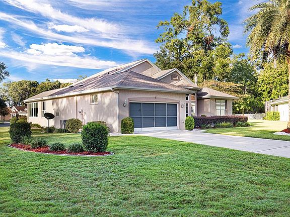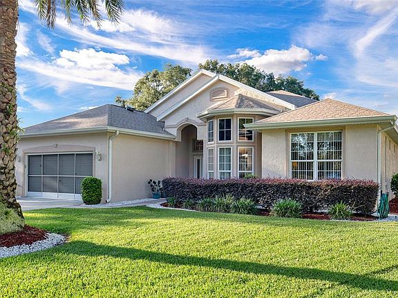 Welcome to this beautifully maintained 3-bedroom, 2.5-bath home located in the highly desirable Eagle Point section of Oak Run, a premier 55+ community. Offering 2,082 sq. ft. of heated living space and 3,134 total sq. ft., this spacious home is filled with upgrades and features that make it a true standout. "As you watch the video or browse the photos, you'll notice that the home is fully furnished-and all of the furnishings you see are included, along with the golf cart." Step inside to find soaring vaulted ceilings, tile and carpet flooring, and a large Florida room with its own dedicated heating and cooling system—perfect for year-round enjoyment. The open-concept kitchen and living room is ideal for entertaining, featuring a cooktop range, built-in microwave, dishwasher, disposal, refrigerator, and washer/dryer. The indoor laundry room includes overhead cabinetry for added storage. The oversized primary suite (20' x 23') is a retreat of its own, with a large walk-in closet and a spacious en suite bathroom that boasts double sinks, ample cabinetry, a step-in shower, ceramic tile flooring, and an additional built-in closet. The two guest bedrooms are also generously sized with built-in closets and plush Berber carpeting. Additional highlights include laminate flooring in the Florida room, window treatments throughout, plenty of natural lighting, and a screened lanai with a retractable awning—perfect for enjoying the beautifully landscaped yard and tranquil. The home also features a new roof 2023, a 2018 HVAC system, and a garage with its own air conditioning unit and ceiling fan though out the home for added comfort. "Move in ready and fully equipped,--this home even comes with its own golf cart." This is an exceptional opportunity to live in one of Oak Run’s most sought-after neighborhoods. Schedule your private showing today!
