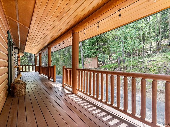 This dream mountain log home sits on 5 private acres surrounded by towering pines and breathtaking panoramic views. The rustic elegance of hand-hewn logs, wood burning fireplace and open concept living create a warm, welcoming retreat, perfect for mountain living. Walkout the double doors from your living room area to the expansive deck which gives you majestic vistas of snow-capped peaks and Denver city lights, bringing nature indoors in every season. The sunsets and sunrises with fill you with tranquility. This immaculate raised RANCH is flooded in natural light with the kitchen, the dining area and living room with views everywhere you look. The kitchen has been lovingly remodeled with all the bells and whistles. The 4 bedroom layout is ideal with a primary suite on the main level and the other 2 main level bedrooms in separate quarters across the ways from the primary, and can be closed off from the living room area by a custom barn door for privacy. The walk-out lower level has LVP flooring and a 4th bedroom, family room and a 3/4 bathroom. The laundry area and storage area have ample space. PLUS walk-out to lower level flagstone patio with ceiling fans and canned lighting to enjoy those mountain evenings. The attached oversized garage has new epoxy flooring. All driveways are paved to the garage and your front door and the detached garage as well! A short walk from the house you will love the newly built 18x34 detached garage/workshop with a 10x10 door, 12' walls, concrete and electricity. Whether you're sipping coffee on the expansive upstairs deck, watching wildlife wander through the property, or stargazing under clear Colorado skies, this secluded haven offers the ultimate blend of comfort, tranquility, and natural beauty.