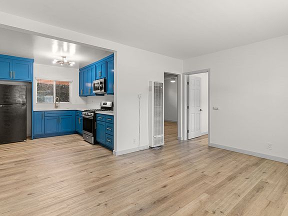 Located in the Hellman neighborhood of Long Beach, near the Fourth Street Corridor (Retro Row), you'll find this upgraded ground-level two bedroom unit boasting modern luxury features throughout including vinyl flooring. The incredibly spacious kitchen boasts eye-catching blue cabinetry, quartz countertops, pictured stainless steel appliances included, and a custom light fixture, all which add to the stunning balance of colors.