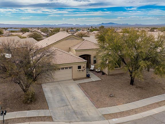 Located in the desirable Vail School District, this 3-bedroom, 2-bath home offers nearly a quarter acre with breathtaking mountain views. The open floor plan features soaring ceilings, granite counters, island kitchen with pantry, and stainless steel appliances. The spacious primary suite includes dual walk-in closets, soaking tub, and walk-in shower. A 2.5-car garage with workshop and temp controlled unit adds function and comfort. The landscaped backyard is designed for entertaining with turf, covered patio, ceiling fans, and screened enclosures. Recent updates include newer flooring, water heater, and storage shed. Just minutes from shopping, dining, and freeway access, this property blends modern convenience with scenic living in Vail.