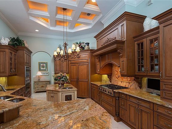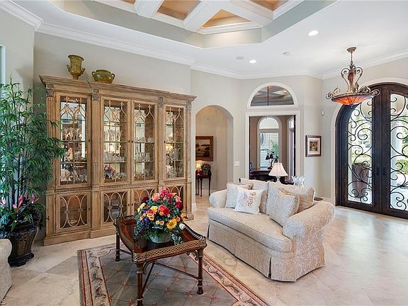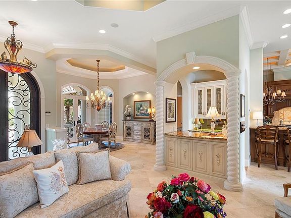 Inspired by the classic Chateaus along the coastline of southern France, this grande estate located on the coveted island of Isola Bella is a rare opportunity. Designed and built by Divco Custom Homes in collaboration with the one-time property owners. This 4-bedroom, 4-and-2-half-bath residence boasts the finest custom architectural details and embodies classical elegance and quality. Entering the residence through impressive wrought iron double doors, you are indulged by marble flooring, soaring custom coffered ceilings, gourmet kitchen with breakfast bar, Wolf appliances, built-in oven, 3 dishwashers, living room with gas fireplace leading to courtyard and pool area, large first-floor master suite with luxurious master bath with marble flooring highlighted with Mother of Pearl inlays, beautiful tourelle ceiling and whirlpool spa garden tub. Unsurpassed privacy and tropical beauty encompass the outdoor living space which offers an infinity-edge pool, spa, outdoor kitchen, fire pit, and 2 outdoor showers, overlooking your own private floating boat dock. Miromar Lakes Beach and Golf Club is a prestigious, amenity-rich community.