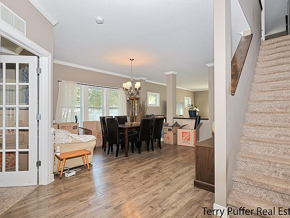 This spacious home features an open floor plan and beautiful curb appeal, nestled just minutes from top-rated schools, shopping, dining, and major highways. The large great room with fireplace flows seamlessly into the kitchen and dining area—perfect for entertaining. A den with French doors, main floor powder room, and a separate mudroom with built-in bench add convenience and functionality. Upstairs, the primary suite offers a private full bath and walk-in closet. Three additional generously sized bedrooms, a full bath, and second-floor laundry round out the upper level. Possible 5th bedroom or large office in the finished basement with large entertainment area. Enjoy outdoor living on the large patio, perfect for summer evenings. Built in spring 2015, this home blends comfort, space, and style in a prime Portage location!