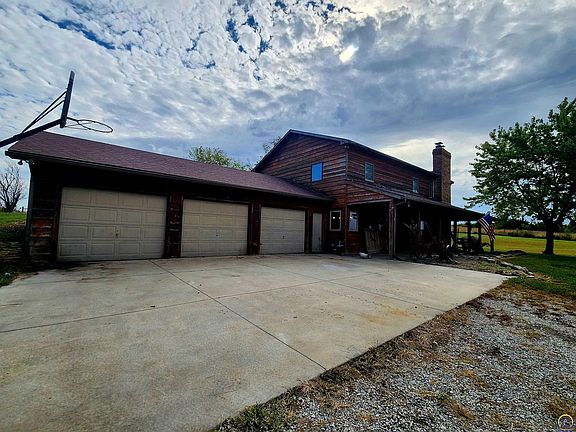 If having a hobby farm is on your wish list or you just want some extra space and privacy, look no further! This cozy berm cabin with just under 10 acres is looking for new owners. This country setting features a 2-story home with 4 bedrooms, 2.5 bathrooms, open concept kitchen/living room, a walk in pantry, mainfloor laundry, en suit bathroom and walk in closet in the primary bedroom, heated bathroom floors in upstairs full bath, appliances included, an attached 3 car garage, covered front porch and beautiful views of the countryside. Enjoy family and friends in the open concept kitchen, dining and living room while enjoying a fire in the wood stove. The natural lighting is stunning throughout. This property has ample storage for all your outdoor activities, including the 3 car attached garage and 4 outbuildings! One outbuilding has a vast amount versatility, as it has heat, AC, and plumbing. This building used to be a bakery, but could be a mother-in-law suit, business, or workshop. The possibilities are endless! Beautiful trees surround the property and include an established apple tree. Existing fences on the property are ready for livestock. The location can't be beat as it is 14 miles from Topeka, 20 miles from Holton, 10 miles from Prarie Band, and 17 miles from Perry Lake! This property is being sold AS IS.