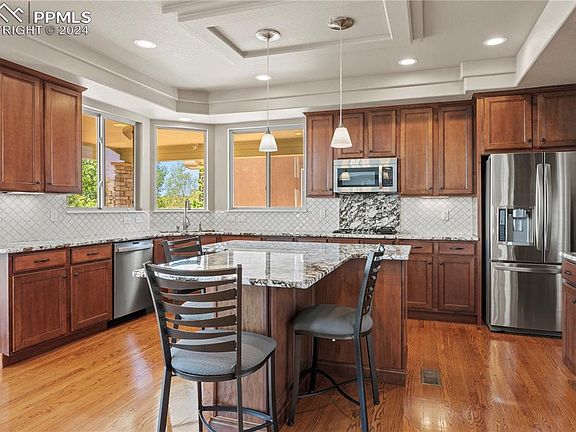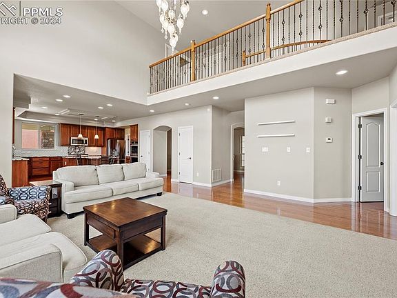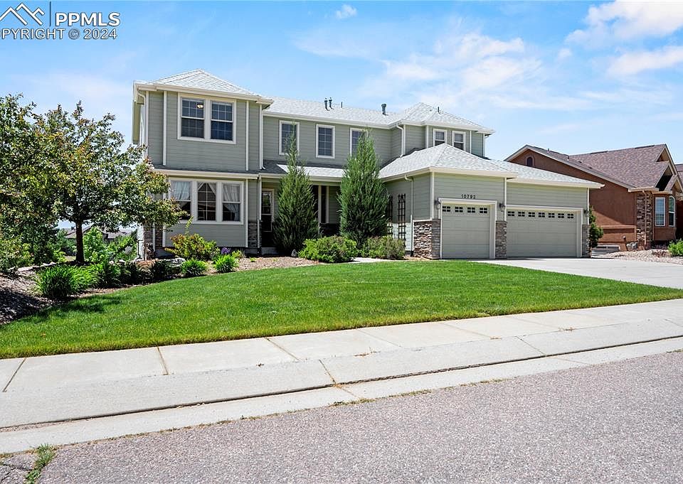 This expansive home offers stunning views of Pikes Peak and backs to the Antler Creek Golf Course. The open kitchen-to-living-room floor plan is perfect for modern living, featuring floor-to-ceiling windows that showcase breathtaking views of the Front Range. Upstairs, the large primary bedroom boasts more stunning views of Pikes Peak. The primary bathroom includes a double vanity, a standalone shower, and a walk-in closet. The upper level also has two additional bedrooms and a bathroom. Head down to the walk-out basement, an entertainer's dream with a spacious open layout and a wet bar, perfect for hosting guests. This level also includes one more bedroom and bathroom, ideal for visitors. Relax on your covered deck or grill on the patio while enjoying the incredible mountain views. Plus, you can easily pack up your golf bag and hit the course right from your backyard.