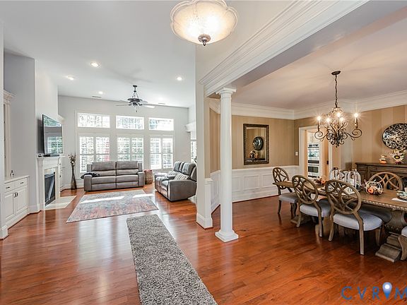 Welcome to 10793 Kings Pond Drive located on .67 acres in the sought-after Brickshire community of New Kent! As you arrive, you’ll notice the aggregate driveway, covered front stoop, Hardiplank siding, dimensional roof, and 2-car attached finished garage with automatic door openers. Step inside to find 10-foot ceilings, hardwood flooring, and shutter blinds throughout much of the main level. The foyer opens to a formal dining room with triple crown molding, chair rail with picture frame, and columns. The spacious family room features built-in bookcases, recessed lighting, ceiling fan, and a gas fireplace with mantle. The gourmet eat-in kitchen includes granite countertops, an eat-up bar, walk-in pantry, stainless steel appliances (double oven, gas range, microwave, dishwasher, and disposal), and recessed lighting. A wine or coffee bar area adds extra charm and function. The mudroom/laundry room offers tile flooring and a coat closet. The first-floor primary suite provides a private retreat with carpet, crown molding, ceiling fan, 2 walk-in closets, and a spa-like en suite bath featuring a garden tub, tiled shower, tile flooring, double vanity, and water closet. Addit'l 1/2 bath completes the 1st flr. The bonus room over the garage includes carpet & ceiling fan. The finished walk-out basement expands your living space with a recreation room, media room, workout room, and walk-in storage. Bedroom 2 has a walk-in closet and shares a Jack-and-Jill bathroom with Bedroom 3, while Bedroom 4 has a full bathroom with tile floors and tub/shower. Outdoor living is a delight with a deck, covered patio, and lower patio - perfect for entertaining or relaxing. There is also a whole house generator! Brickshire offers resort-style amenities including a clubhouse, fitness center, pool, tennis and basketball courts, scenic walking trails, and the award-winning Brickshire Golf Club. Conveniently located near I-64 for easy access to Richmond and Williamsburg!