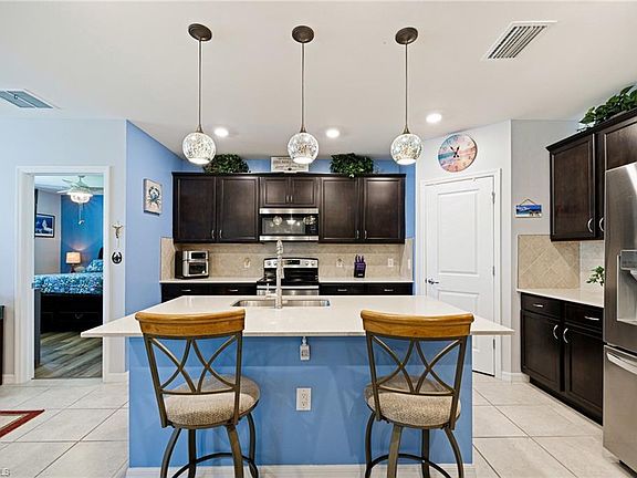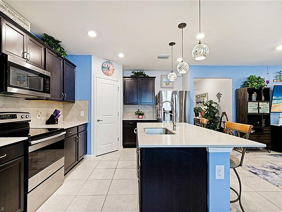Beautifully Maintained NEWER BUILD home with great upgrades throughout! This move-in ready 3-bedroom, 2-bathroom home offers a perfect blend of comfort, style, and convenience. Featuring TILE FLOORING throughout the main living areas and luxury vinyl in the bedrooms, this home is designed for both elegance and durability. The open-concept layout includes a FULLY UPGRADED KITCHEN with STAINLESS STEEL APPLIANCES, custom backsplash, QUARTZ COUNTERTOPS, a large farmhouse sink, and a modern high-arc faucet—perfect for everyday living and entertaining. The spacious primary suite features a large walk-in closet and a dual-sink vanity, while the guest bathroom includes a tub for added convenience. FRESH INTERIOR PAINT and upgraded light fixtures throughout give the home a bright and welcoming feel. Step outside to enjoy a PRIVATE SCREENED-IN LANAI, a charming front screened porch, and a paved backyard terrace—ideal for outdoor dining and relaxation. The home also features upgraded landscaping, a fully fenced yard, and gutters around the entire exterior. Furniture is negotiable—if you like what you see, you can keep it! Located in a NO CDD community with LOW HOA FEES, and just minutes from I-75, RSW Airport, Downtown Fort Myers, Publix, shopping, and dining—this home truly checks all the boxes.