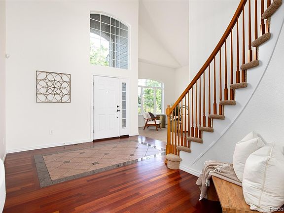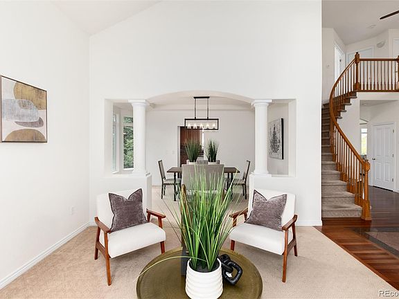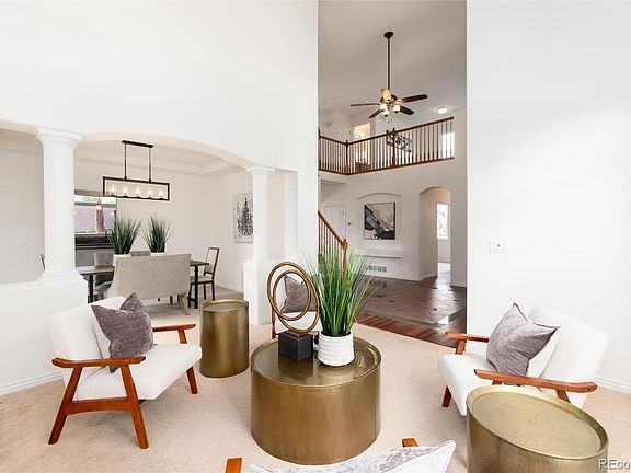 Welcome to this quiet cul-de-sac home in the Estates at Quail Creek with some of the lowest property taxes in Parker! As you step inside, a grand entryway & sweeping curved staircase welcomes you. The elegant two-story living room flows effortlessly into the formal dining room, which is beautifully accented by a bay window. Then wander into the open-concept gourmet kitchen leading to a cozy family room & fireplace.  The kitchen is a chef's dream, with striking Colorado Agate slab granite countertops, a center island, 42" cherry cabinets, glass subway tile backsplash, stainless appliances, including a gas cooktop & double ovens. The eat-in kitchen provides direct access to extended outdoor living with a Trex deck & dry-below system perfect for evenings around the firepit.