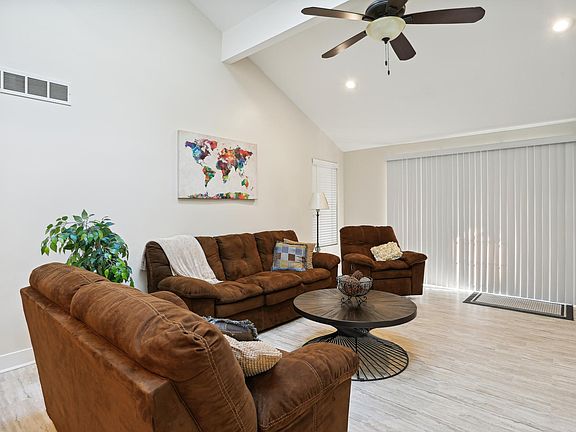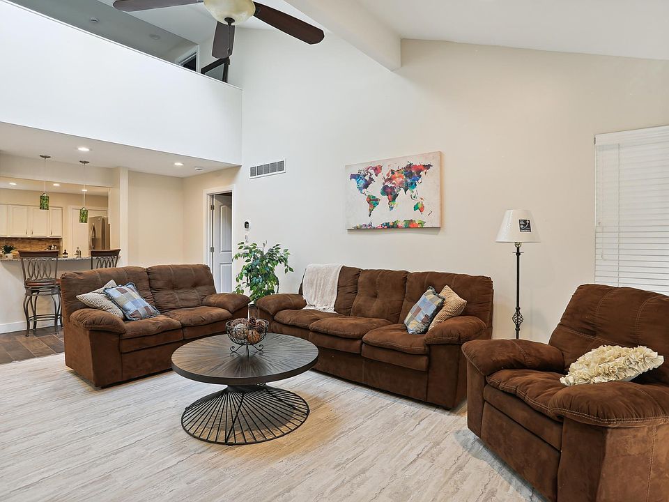 FULLY FURNISHED UNIT WITH UTILITIES. This comprehensively updated and expanded zero-lot home offers an exceptional 3 bedroom and 3 1/2 baths and nearly 1,900 square feet. Ceramic wood-look flooring runs from the front entry through the kitchen powder room, and to the 1st floor master suite. The updated kitchen boasts granite counters, tile backsplash, and stainless steel appliances. There is a walk-in laundry room. The great room has a dramatic cathedral ceiling, and the fireplace features a stone surround that runs to the ceiling. A sliding glass door opens onto the covered deck and fenced backyard. The primary bedroom has cathedral ceiling and an en suite bath with double vanities and custom walk-in shower, as well as a huge walk-in closet. The 2nd floor features an open loft area at the top of the stairs, 2 generous sized bedrooms and 2 full baths.