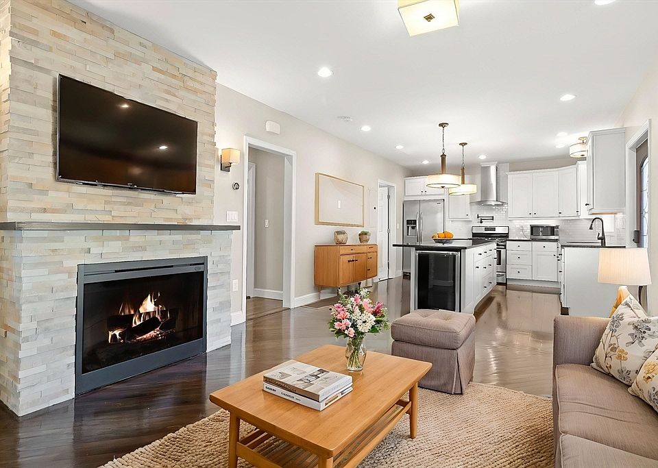 Cozy fireplaceHistoric town centerLobster pot-filler faucetHardwood floorsOversized islandBay windowsBeautifully updated kitchen