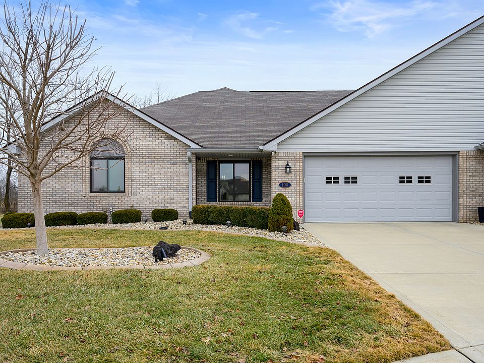 Discover effortless living and upgrades galore! This beautifully upgraded 2-bedroom, 2-bathroom ranch condominium is situated on the largest lot in Section 1. You will love this truly exceptional home with top-tier upgrades and prime location. Designed with an open floor plan and 9-foot ceilings, including an elegant tray ceiling, this home offers a spacious and inviting atmosphere. The primary suite is a true retreat, featuring a luxurious walk-in tiled shower and generous closet space. The kitchen is a chef's dream with quartz countertops, all Whirlpool appliances, and stylish finishes. Enjoy year-round comfort with the Halo air purifier. Step outside to relax on the covered porch or entertain on the extra-large concrete patio, complete with a partial privacy fence. The exceptional curb appeal is enhanced by the beautiful landscaping, striking blue spruces, and outdoor lighting that makes this home shine day and night.
